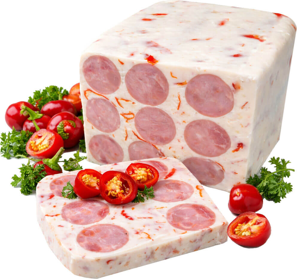 Fleischgenuss kombiniert mit Frischkäse und fruchtiger Kirschpaprika.